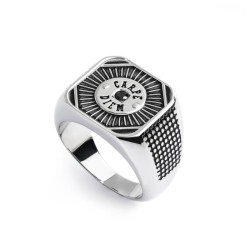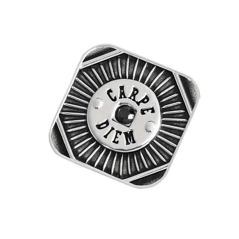 Descrizione: Piastrina quadrata in acciaio per anello, con al centro un elemento esagonale con trama con pvd nero a linee. Al centro elemento tondo con cubic zirconia nero e scritta "CARPE DIEM", ai lati sfere di acciaio.