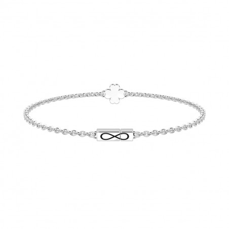 Descrizione: bracciale in acciaio 316L maglia forzatina con elemento quadrifoglio al centro. Dimensioni: maglia 1,5 mm, quadrifoglio 5,3x5,3 mm