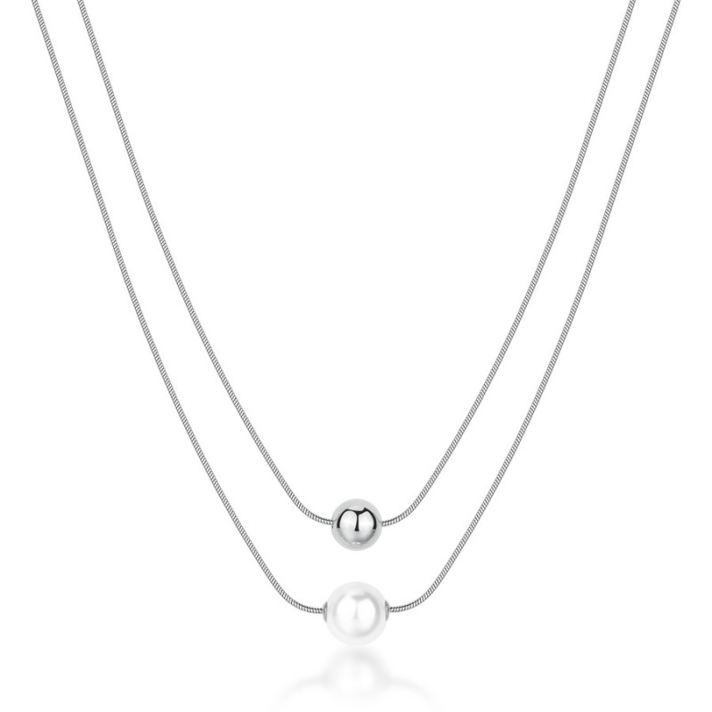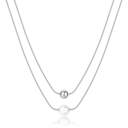 Descrizione: collana in acciaio 316L, a doppio filo con pendente a sfera e perla di conchiglia
