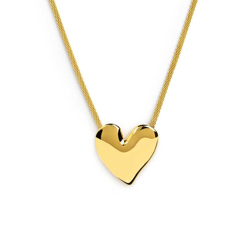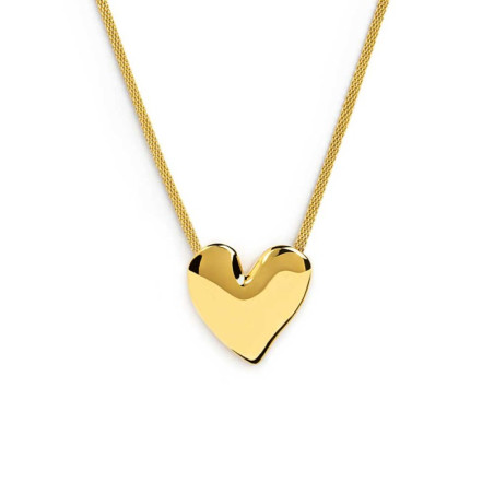 Descrizione: Collana in acciaio pvd oro o acciaio/acciaio pvd oro con catena mesh con centrale a forma di cuore irregolare martellato. Lunghezza totale 44 cm regolabile tramite cursore da 39 cm fino a 44 cm.