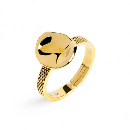 Descrizione: Anello in acciaio o acciao con pvd oro a fascetta con trama a catena mesh, al centro bottone martellato con misura 1*1 cm.