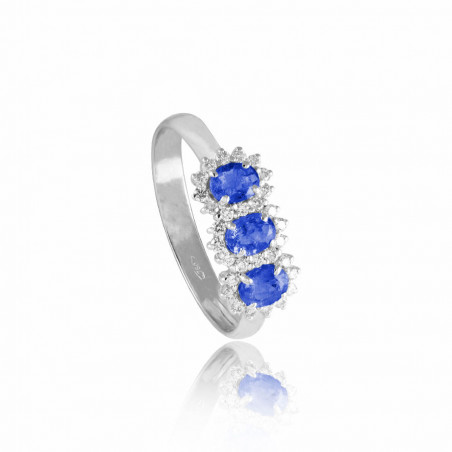 Descrizione: anello fantasia trilogy girasoli - oro bianco 750/1000 (18kt) - peso g 2,50 - pietre preziose: 3 zaffiri naturali taglio ovale ct 0,78 - diamanti naturali taglio brillante ct 0,22 colore F/G purezza VS