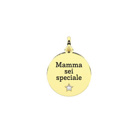 Descrizione: Ciondolo in acciaio 316L satinato con cristallo. Scritta: Mamma sei speciale… famiglia. Dimensioni: ciondolo fi 15 mm, pietra fi 1.25 mm
