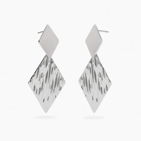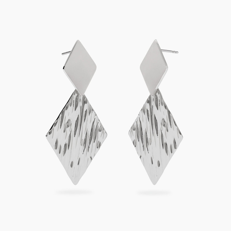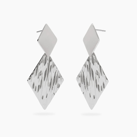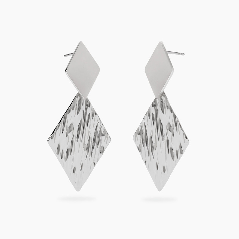 Descrizione: Orecchini in acciaio 316L, lunghezza totale orecchino 5.2 cm, con pendenti martellati. Dimensioni: elemento superiore 13.2x20 mm, pendente 24.7x35.7 mm