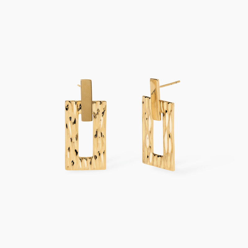 Descrizione: Orecchini in acciaio 316L, lunghezza totale orecchino 3.2 cm, con pendenti rettangolari martellati. Dimensioni: elemento superiore 4x15 mm, pendente 15x25 mm