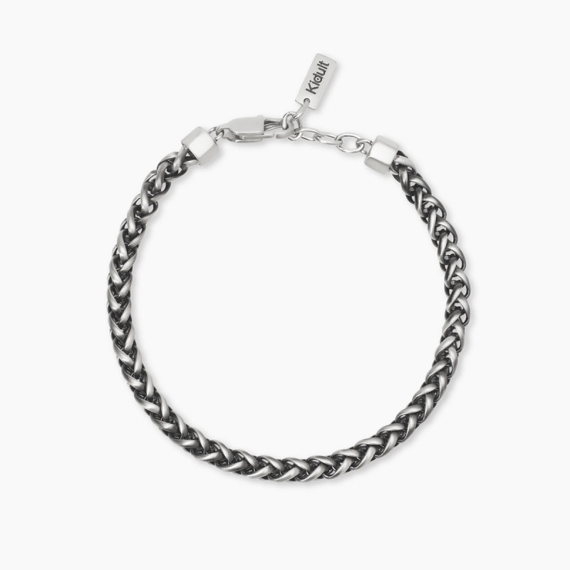 Descrizione: Bracciale in acciaio 316L, lunghezza regolabile da 19 a 21 cm, con catena spiga. Dimensioni: larghezza catena 5 mm