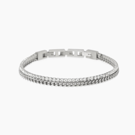 Descrizione: Bracciale tennis in acciaio 316L, lunghezza regolabile da 19.5 a 21 cm, con catena franco e cristalli. Dimensioni: larghezza catena 3 mm, pietre fi 2.5 mm, larghezza totale bracciale 6 mm