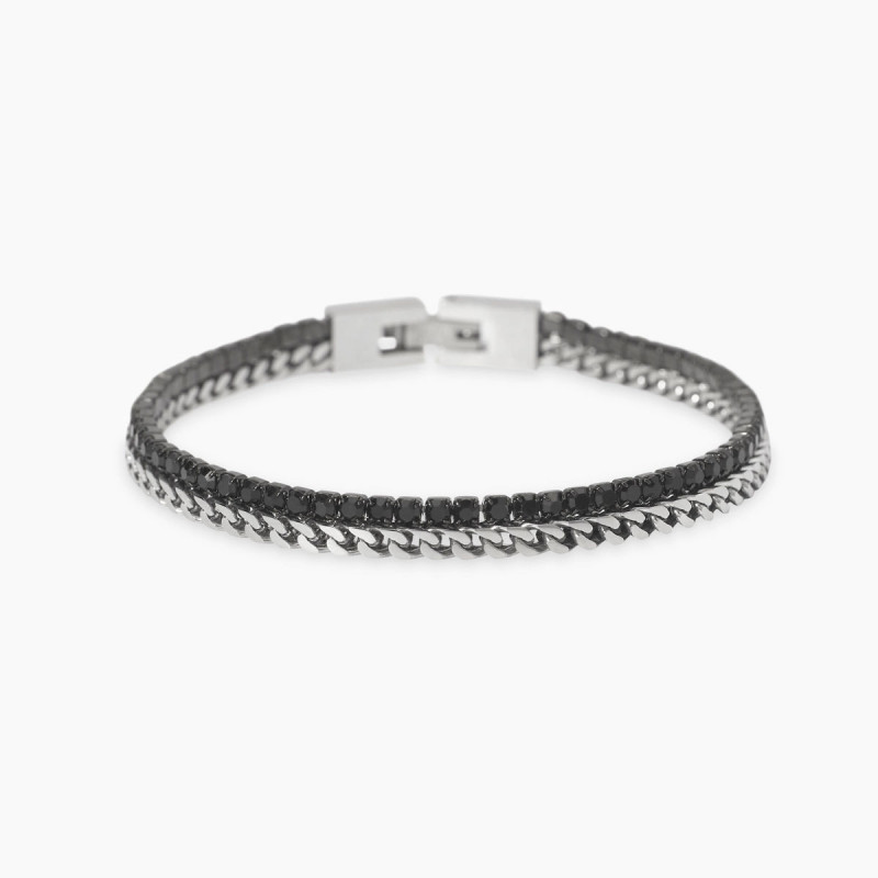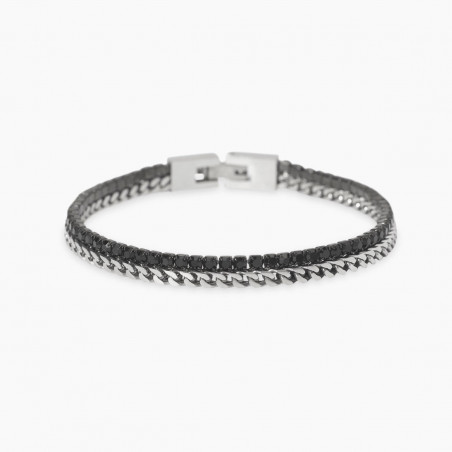 Descrizione: Bracciale tennis in acciaio 316L, lunghezza regolabile da 19.5 a 21 cm, con catena franco e cristalli. Dimensioni: larghezza catena 3 mm, pietre fi 2.5 mm, larghezza totale bracciale 6 mm