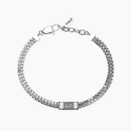 Descrizione: Bracciale in acciaio 316L, lunghezza regolabile da 19 a 21 cm, con catene venete ed elemento centralee infinito lucido e in PVD nero. Dimensioni: larghezza catena 2.4 mm, centralee 16.5x6.2 mm