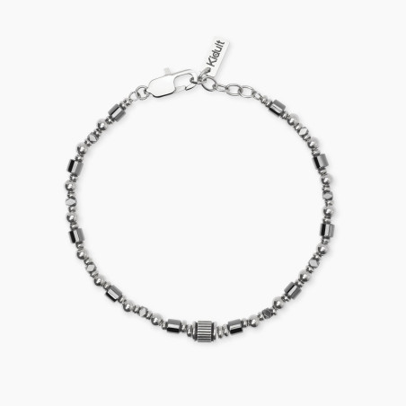 Descrizione: Bracciale in acciaio 316L, lunghezza regolabile da 19 a 21 cm, con elemento centralee a strisce, cilindri e cubetti faccettati. Dimensioni: elemento 6.6x6 mm, sfere fi 3.7 mm, pietre fi 4 mm e 2.7x2.7 mm