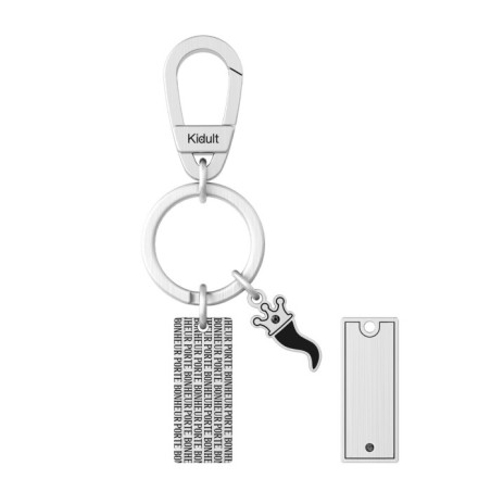 Descrizione: portachiave in acciaio 304/316L satinato con ciondolo rettangolare e ciondolo cornetto PVD nero, cristalli neri. Scritta: PORTE BONHEUR. Dimensioni: moschettone 35 mm, ciondolo 35x14 mm, cristalli fi 2 mm