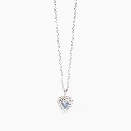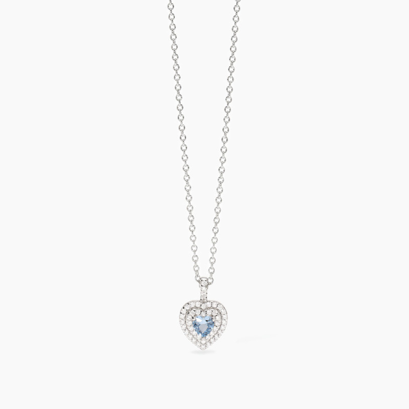 Descrizione: Girocollo in argento 925 con catena rolò 1.5 mm e pendente cuore 10.8x11.2 mm con acquamarina sintetica 5x5 mm e zirconi fi 1.25 mm, lunghezza regolabile da 39 a 43 cm