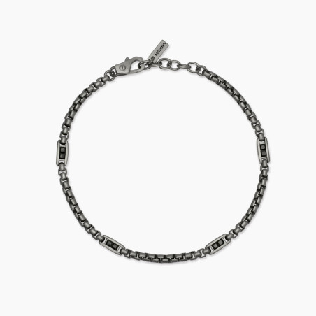 Descrizione: Bracciale in argento 925 sabbiato con catena veneta 3 mm, elementi 8.5x3.8 mm e zirconi neri taglio quadrato 2x2 mm, lunghezza regolabile da 19 a 21 cm