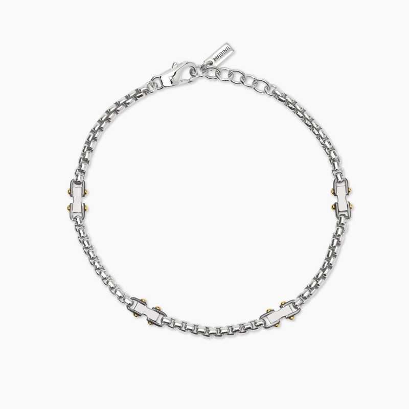 Descrizione: Bracciale in argento 925 con catena veneta 3 mm ed elementi 10.5x5 mm lucidi e bruniti con viti fi 1.6 mm placcate oro 18K, lunghezza regolabile da 19 a 21 cm