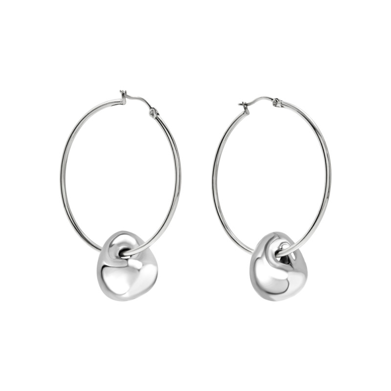 Descrizione: Hoop in acciaio lucido con elemento ovale removibile dalla forma fluida. Diametro 4,5 cm. Dimensioni elemento 1,9 x 1,8 cm.