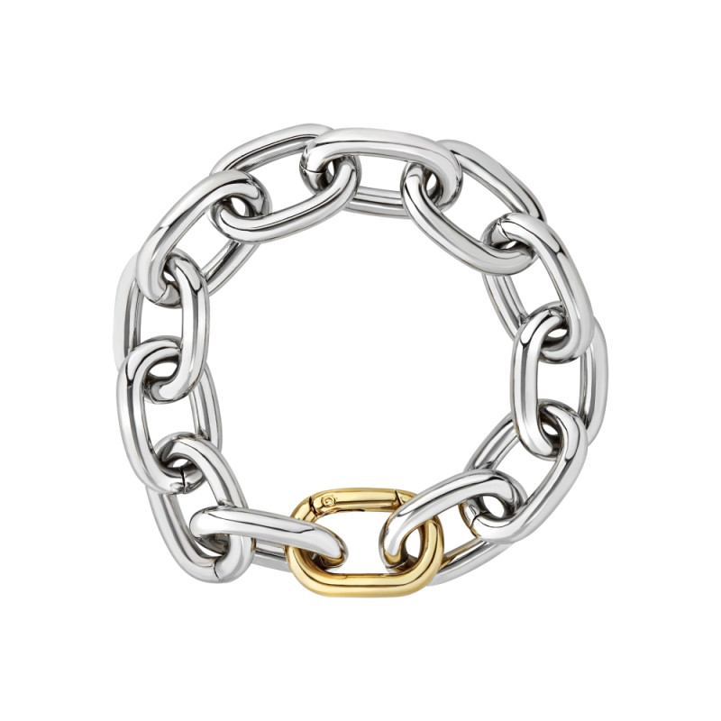 Descrizione: Bracciale maglia in alluminio lucido IP gold con maglie ovali. Chiusura in acciaio. Lunghezza massima: 22,5 cm.