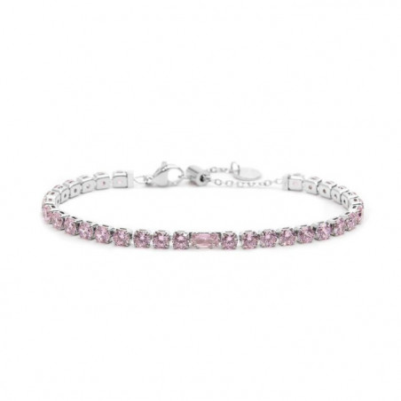 Descrizione: bracciale in acciaio con catena tennis con cubic zirconia 4 mm, con al centro un cubic zirconia taglio baguette. Lunghezza totale 19 cm regolabile tramite cursore da 19 cm a 15 cm. Chiusura con moschettone. Marlù logo tag presente all' estremità.