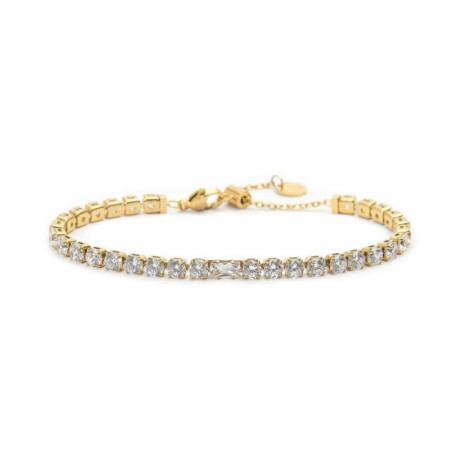 Descrizione: bracciale in acciaio con catena tennis con cubic zirconia 4 mm, con al centro un cubic zirconia taglio baguette. Lunghezza totale 19 cm regolabile tramite cursore da 19 cm a 15 cm. Chiusura con moschettone. Marlù logo tag presente all' estremità.