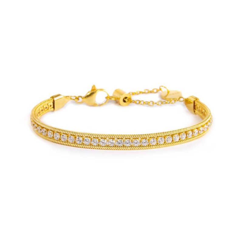 Descrizione: una cascata lucente di tennis colorati per far risplendere la tua personalità! Bracciale a triplo filo con catena tennis al centro, zirconi fi 2,5 mm e catena snake squadrata ai lati in acciaio.