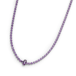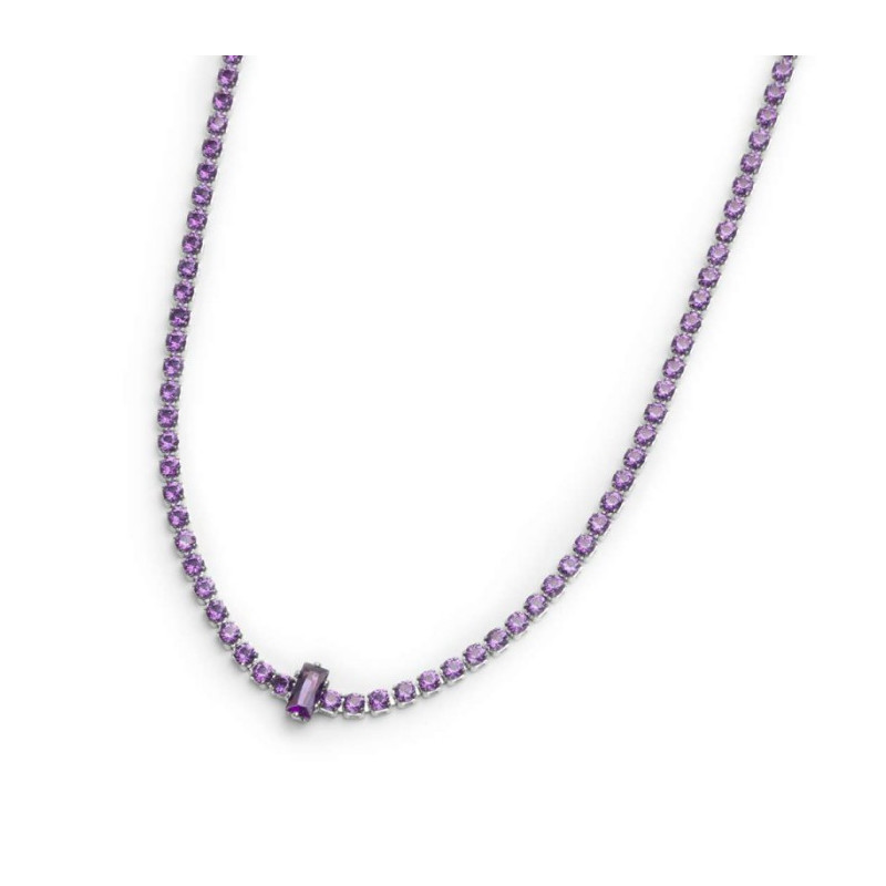 Descrizione: collier in acciaio choker, catena tennis con cubic zirconia rotondi e baguette. Zirconi di diametro 2 mm con al centro uno zircone a taglio baguette disposto verticalmente tono su tono. Lunghezza totale 42 cm regolabile tramite cursore da 42 cm a 32 cm. Chiusura a moschettone. Marlù logo tag presente all'estremità.