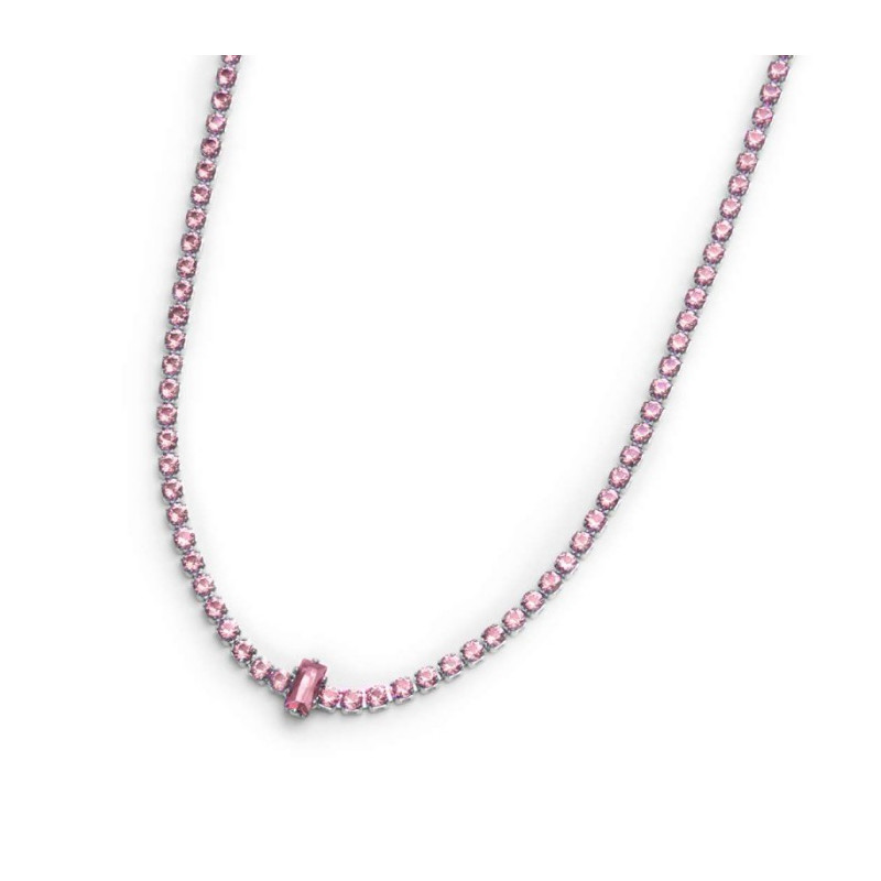 Descrizione: collier in acciaio chocker, catena tennis con cubic zirconia rotondi e baguette. Zirconi di diametro 2 mm con al centro uno zircone taglio gabuette disposto verticalmente tono su tono. Lunghezza totale 42 cm regolabile tramite cursore da 42 cma 32 cm. Chiusura a moschettone. Marlù logo tag presente all'estremiità