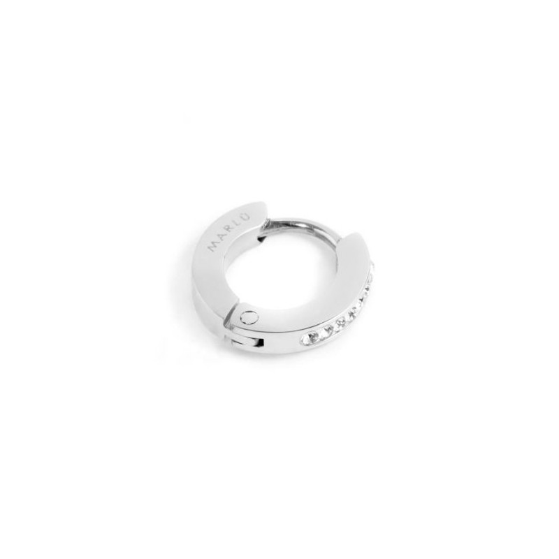 Descrizione: Mono orecchino con cristalli, cerchio con diametro 11 mm, chiusura a pressione. Logo Marlù laserato sul lato. Materiali: acciaio, pvd, cristalli