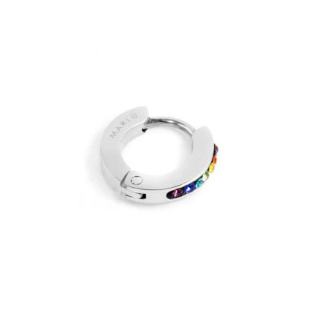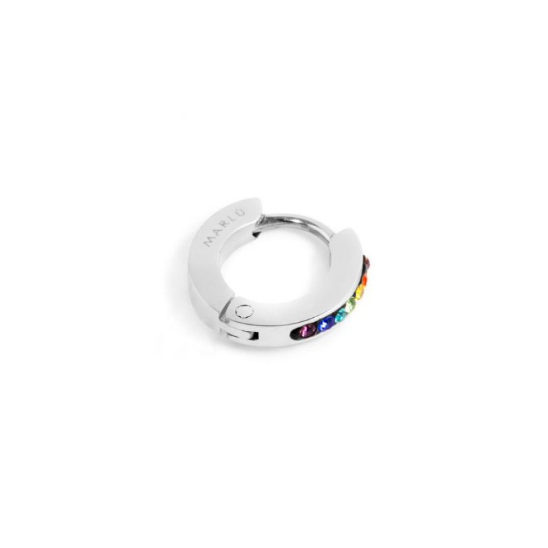 Descrizione: Mono orecchino con cristalli, cerchio con diametro 11 mm, chiusura a pressione. Logo Marlù laserato sul lato. Materiali: acciaio, pvd, cristalli