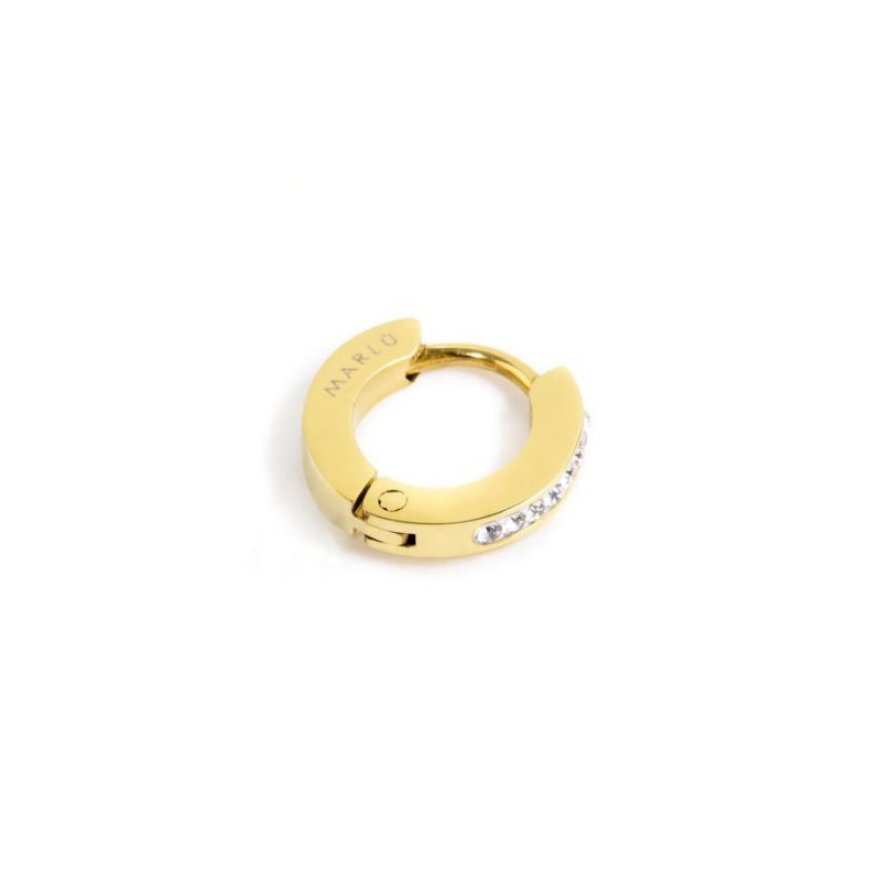 Descrizione: Mono orecchino con cristalli, cerchio con diametro 11 mm, chiusura a pressione. Logo Marlù laserato sul lato. Materiali: acciaio, pvd, cristalli
