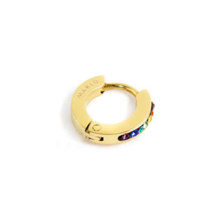 Descrizione: Mono orecchino con cristalli, cerchio con diametro 11 mm, chiusura a pressione. Logo Marlù laserato sul lato. Materiali: acciaio, pvd, cristalli