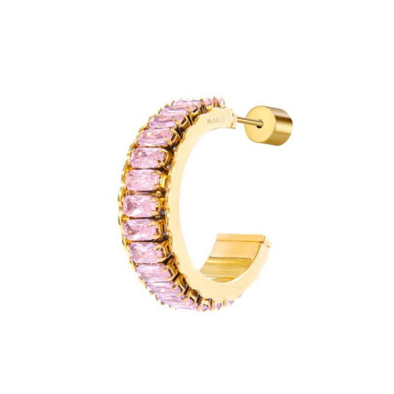 Descrizione: una cascata lucente di colori per far risplendere la tua personalità! Orecchino mono a semi-cerchio con catena tennis, zirconi taglio baguette e base in acciaio.