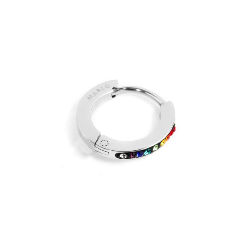Descrizione: Mono orecchino con cristalli, cerchio con diametro 14 mm, chiusura a pressione. Logo Marlù laserato sul lato. Materiali: acciaio, pvd, cristalli