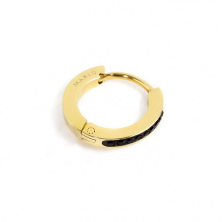 Descrizione: Mono orecchino con cristalli, cerchio con diametro 14 mm, chiusura a pressione. Logo Marlù laserato sul lato. Materiali: acciaio, pvd, cristalli