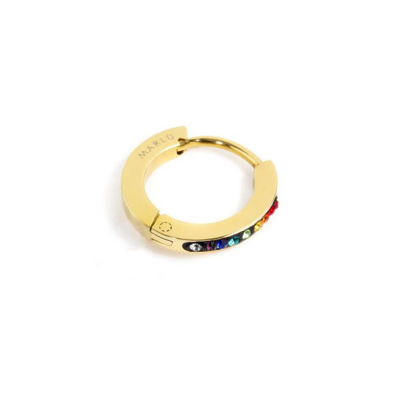 Descrizione: Mono orecchino con cristalli, cerchio con diametro 14 mm, chiusura a pressione. Logo Marlù laserato sul lato. Materiali: acciaio, pvd, cristalli