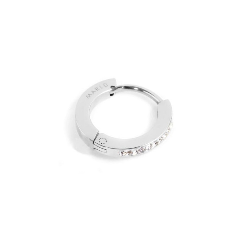 Descrizione: Mono orecchino con cristalli, cerchio con diametro 14 mm, chiusura a pressione. Logo Marlù laserato sul lato. Materiali: acciaio, pvd, cristalli