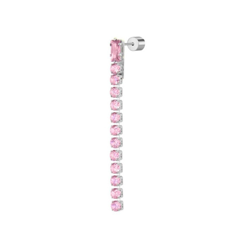 Descrizione: una cascata lucente di colori per far risplendere la tua personalità! Orecchino mono pendente con catena tennis, zircone taglio baguette al vertice e zirconi taglio brillante.