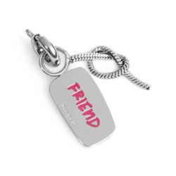 Descrizione: ciondolo doppio in acciaio o acciaio pvd oro: il primo ciondolo è rettangolare 1,1x0,6 cm, sul fronte con la scritta in rilievo "AMO" su smalto rosa e sul retro con la scritta incisa "FRIEND" con smalto rosa. Il secondo ciondolo 1,5x0,5 cm è un nodo con catena snake 8 lati.