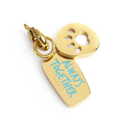 Descrizione: ciondolo doppio in acciaio, il primo ciondolo è rettangolare 1,1x0,6 cm, sul fronte con la scritta "SEMPRE INSIEME" con smalto bianco e sul retro con la scritta "ALWAYS TOGETHER" in smalto azzurro. Il secondo ciondolo è ovale 0,8x0,8 cm con una zampina forata al centro.