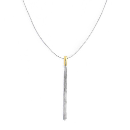 Descrizione: collana in acciaio e acciaio pvd oro con centrale pendente multifilo con misura 7,5 cm. Su una estremità sfera intercambiabile in acciaio pvd oro con diametro 8 mm. Lunghezza totale 60 cm regolabile tramite cursore.