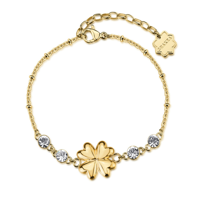 Descrizione: bracciale in acciaio 316L con quadrifoglio e cristalli