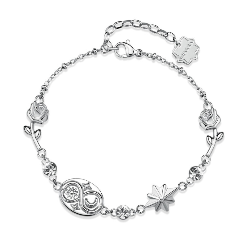 Descrizione: bracciale in acciaio 316L con rosa, rosa dei venti, infinito e cristalli