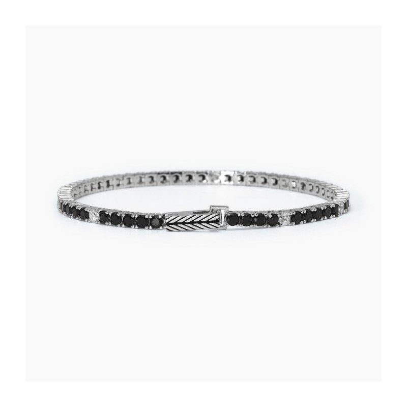 Descrizione: Bracciale tennis da uomo in argento 925 rodiato con zirconi. Diametro degli zirconi: 3 mm. Incastonatura degli zirconi con griffe a quattro punte. Chiusura a pinza con molla con texture spigata.