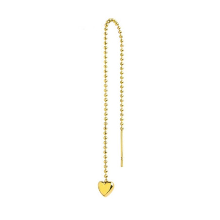 Descrizione: Mono orecchino pendente in acciaio o acciaio pvd oro con catena con sfere e cuore pendente. Chiusura in silicone. Lunghezza totale 11 cm.