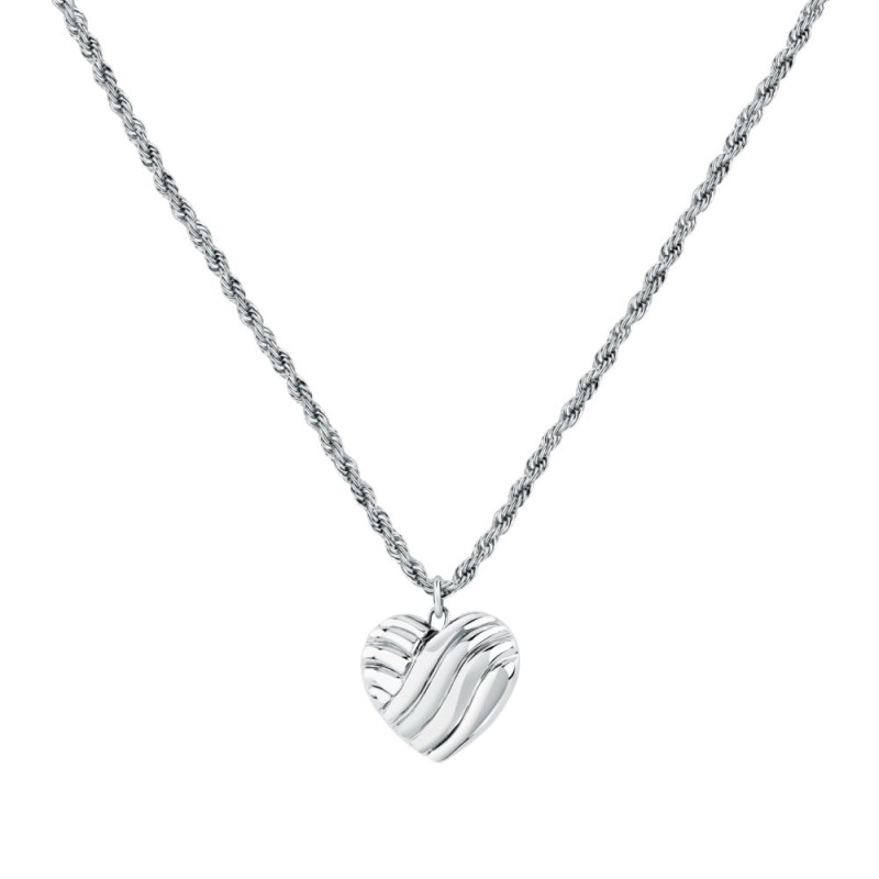 Descrizione: girocollo maglia fune in acciaio con cuore a trama ondulata