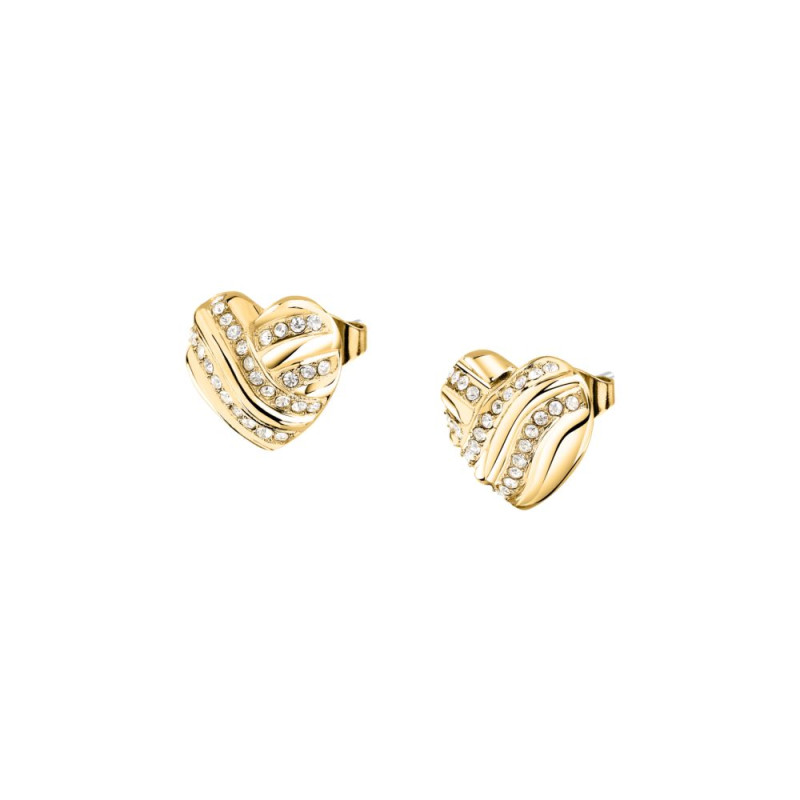 Descrizione: orecchini a lobo con cuori a trama ondulata e cristalli bianchi in acciaio Pvd oro giallo