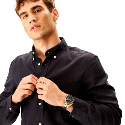 Descrizione: un design deciso definisce il cronografo da uomo Stand Guard che si distingue per la sua cassa in acciaio da 44 mm con finitura bilux, abbinata a una lunetta in acciaio con disco in alluminio e fondello a vite. Impermeabile fino a 10 atmosfere, è caratterizzato da un quadrante lucido, impreziosito da contatori e indici a contrasto che garantiscono massima leggibilità.