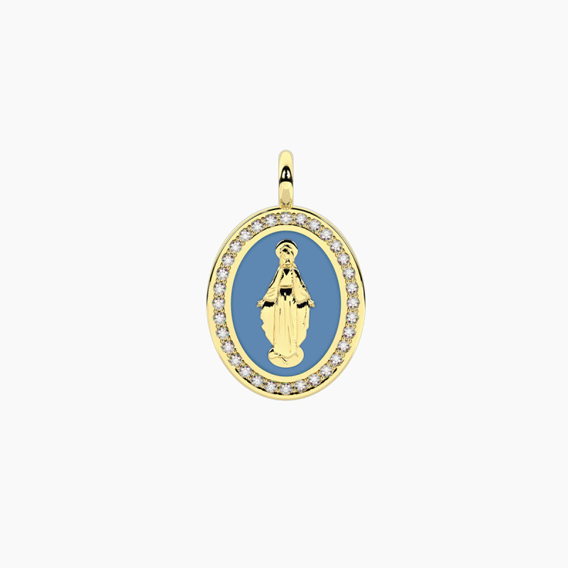Descrizione: Ciondolo in acciaio 316L e/o PVD giallo smaltato ovale Madonnina con cristalli. Dimensioni: ciondolo 13.6x17.8 mm, pietre fi 1 mm