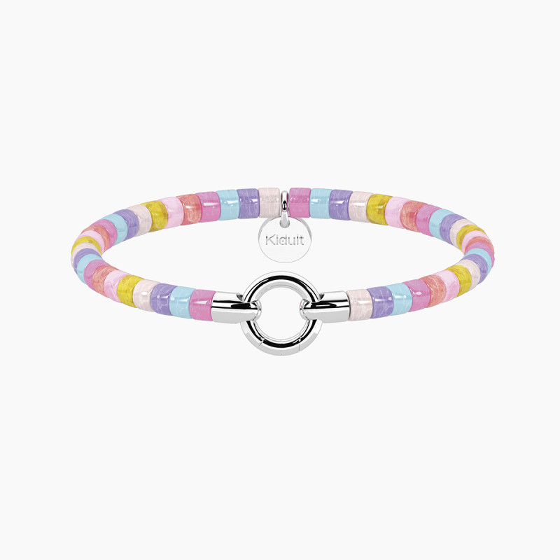 Descrizione: Bracciale in acciaio 316L, lunghezza 17.5 cm, con cilindri di conchiglia multicolor striati e link. Dimensioni: conchiglie 3x4 mm, link fi 12 mm