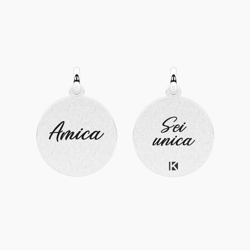 Descrizione: Ciondolo in acciaio 316L satinato. Scritta: Amica Sei unica. Dimensioni: ciondolo fi 15 mm