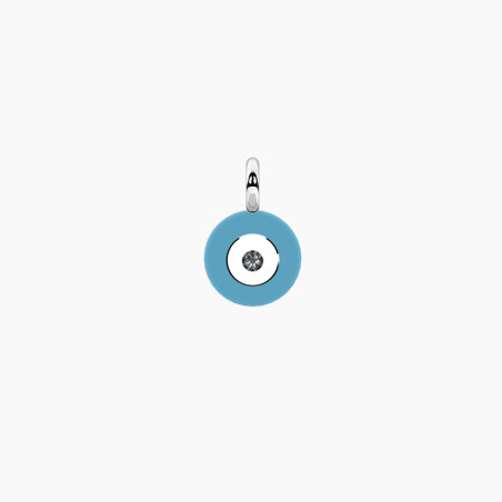 Descrizione: Ciondolo in acciaio 316L smaltato occhio azzurro con cristallo nero. Dimensioni: ciondolo fi 9 mm, pietra fi 2 mm