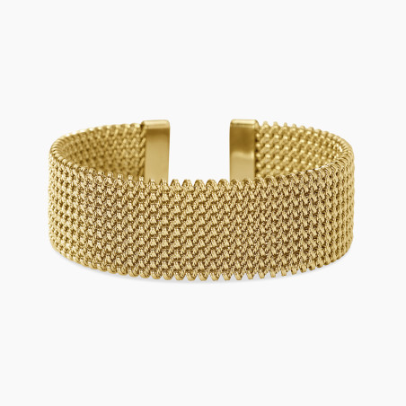 Descrizione: Bracciale cuff in acciaio 304 e/o PVD giallo con maglia mesh. Dimensioni: interne 59x51 mm, larghezza massima bracciale 22 mm